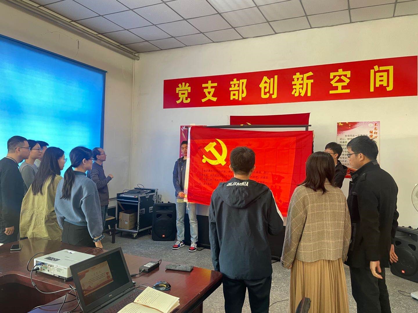 第四項:重溫入黨誓詞。由黨支部書記領誓,支部全體黨員在黨旗下重溫入黨誓詞。