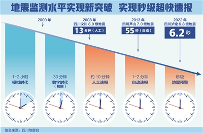 近年來,我國(guó)地震預(yù)警信息產(chǎn)出速度不斷提升,從約10分鐘的人工速報(bào)到1至2分鐘的自動(dòng)速報(bào),再到秒級(jí)的地震預(yù)警,為抗震救災(zāi)提供了強(qiáng)大科技助力。(制圖:張寒)