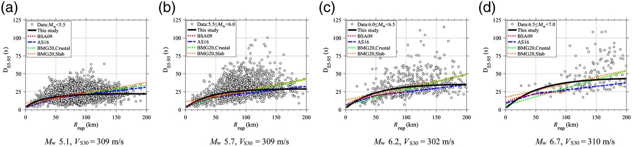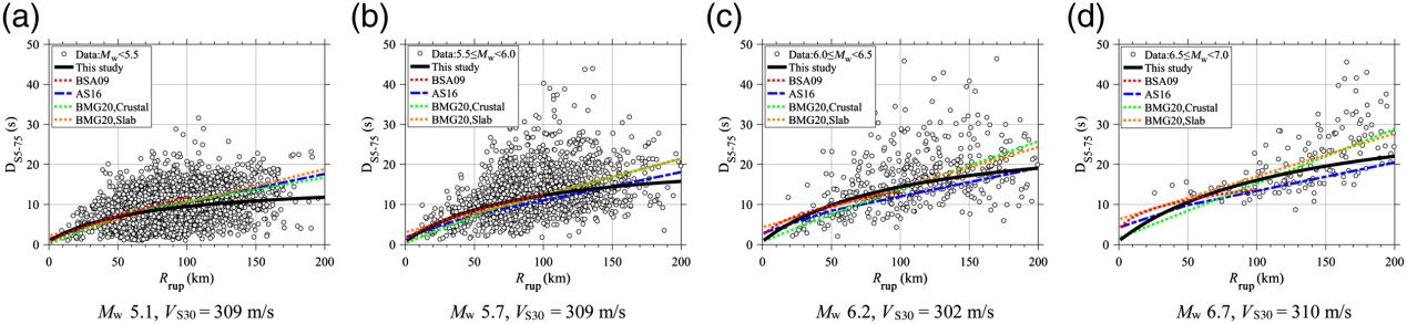 發布時間: 2023-04-11 點擊數量:60833)當斷層距大于100 km時,持時的SVR-GMMs預測結果小于BMG20(圖4)。當M<5.5時,顯著持時隨距離衰減存在明顯的遠場飽和現象,顯著持時的飽和距離為100 km。本文開發的SVR-GMMs有效地捕捉到了顯著持時存在的這一區域衰減特征。