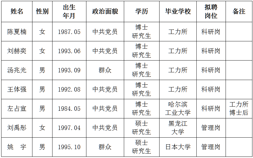 發布時間: 2022-05-30 點擊數量:8774根據中國地震局《關于貫徹執行〈事業單位公開招聘人員暫行規定〉的通知》文件精神和我所用人計劃,經公開發布招聘信息、資格審查、面試等程序確定擬錄人員。現將擬錄人員相關情況公示如下,公示期7天,期間如有異議請與中國地震局工程力學研究所人才資源部或紀檢室聯系,以個人名義反映情況的須署真實姓名,以單位名義反映情況的須加蓋公章。