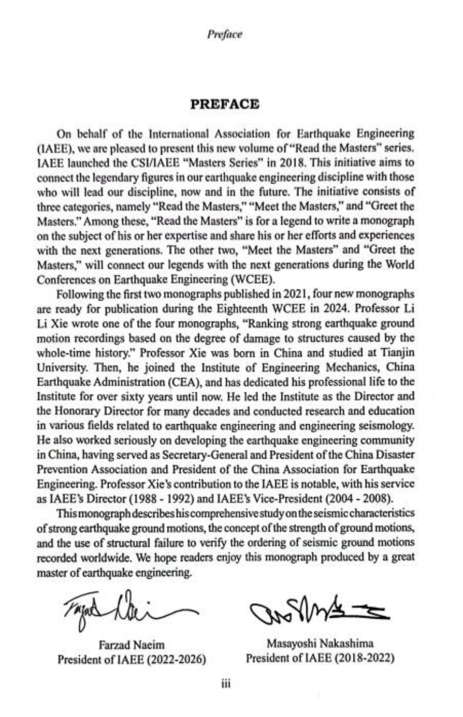 國際地震工程協(xié)會為謝禮立院士出版的專著封面 IAEE本屆主席和上屆主席共同為專著撰寫的前言
